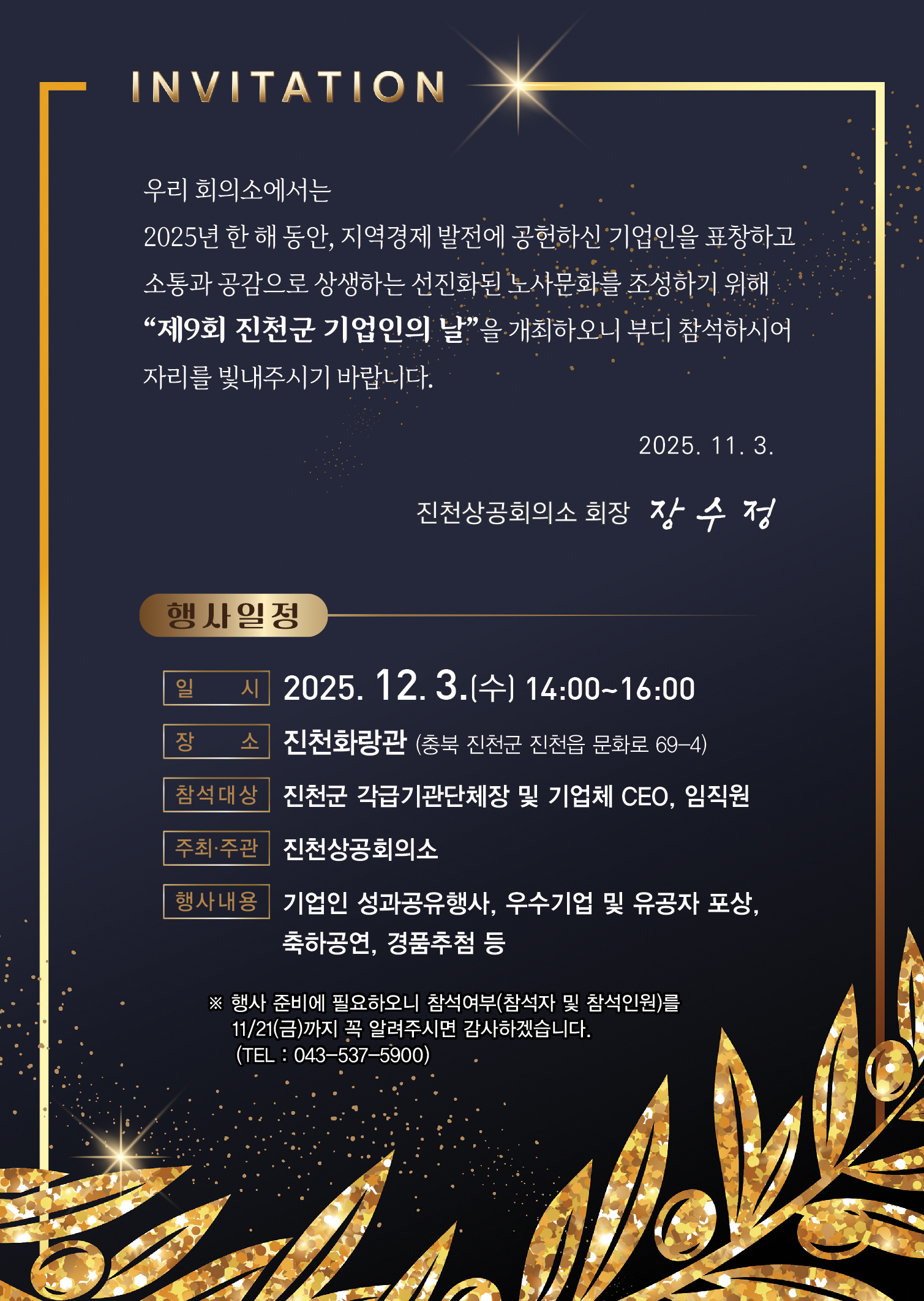 본 회의소에서는 2025년 한 해 동안 지역경제 발전에 공헌하신 기업인을 표창하고 소통과 공감으로 상생하는 선진화된 노사문화를 조성하기 위해 '제9회 진천군 기업인의 날'을 개최하오니 부디 참석하시어 자리를 빛내주시기 바랍니다.