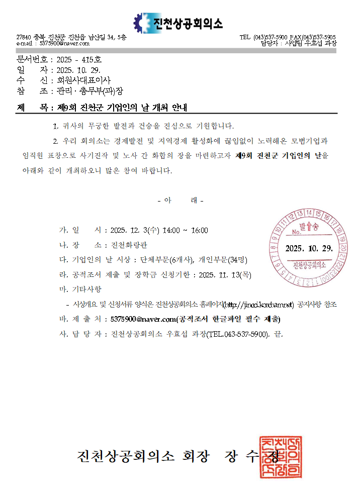 | ‒ | 제9회 진천군 기업인의 날 개최 안내 |