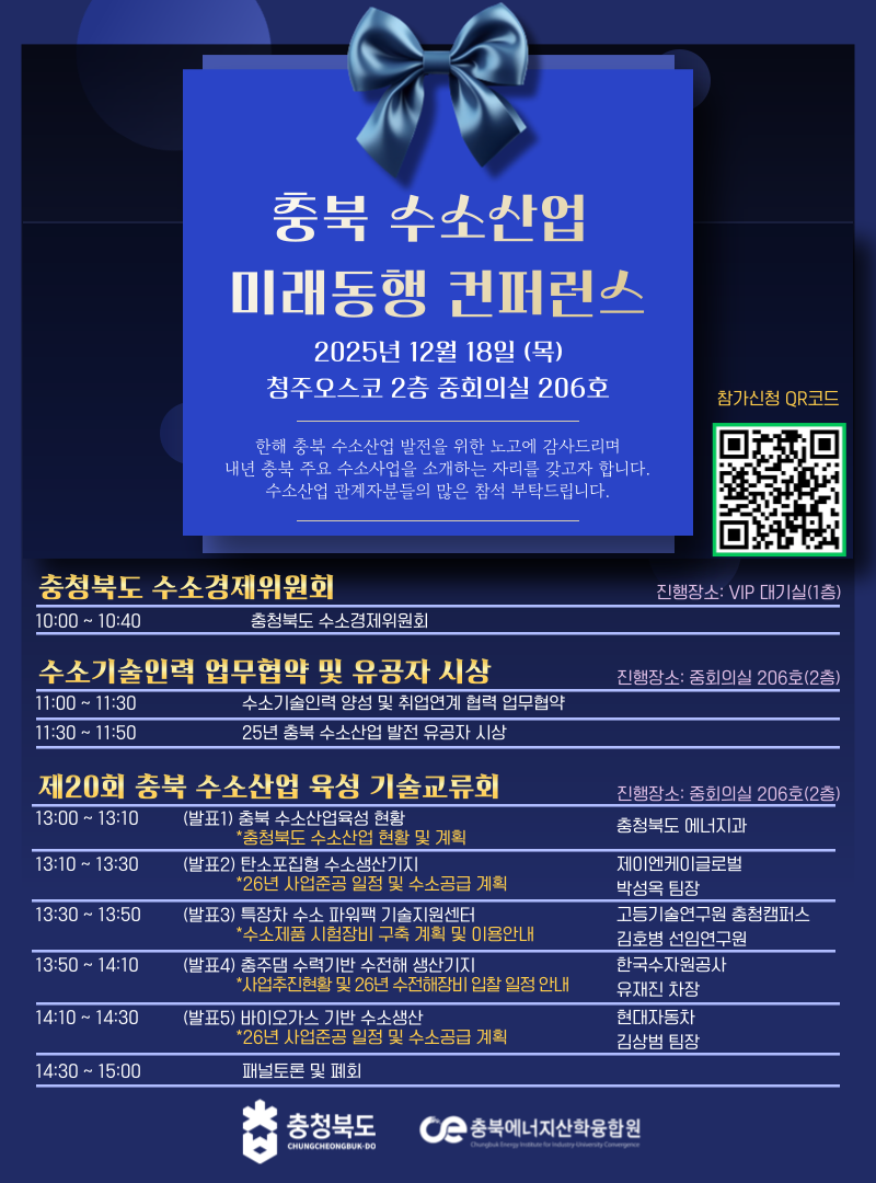 충북에너지산학융합원에서는 내년도 충청북도의 주요 수소사업을 소개하고 수소산업의 발전을 지원하기 위해 충북 수소산업 미래동행 컨퍼런스를 개최하오니 많은 관심과 참석 바랍니다.